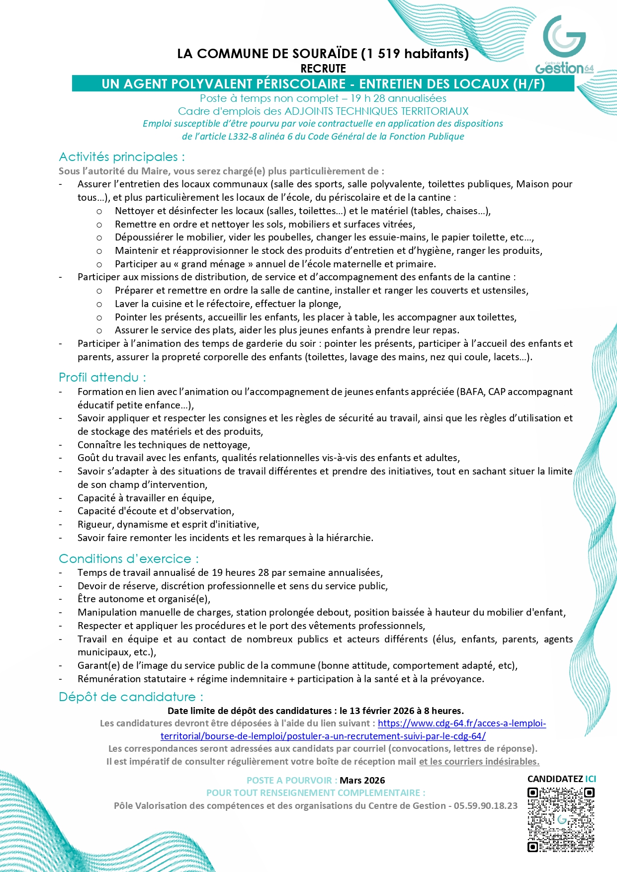 Bienvenue sur le site officiel de la Mairie SOURAÏDE Précédent Suivant Consultez notre météo Températures, précipitations, vent... prévisions sur les 8 prochains jours Quelques chiffres... Les derniers éléments recensés par l'INSEE tracent une photographie quantitative du village La qualité de l'air en temps réel La Communauté Pays Basque s'engage dans l'amélioration continue du suivi de la qualité de l'air, en collaboration avec l'ATMO Nouvelle Aquitaine. NOUS CONTACTER Dernière Actualité La commune recrute un Agent polyvalent périscolaire H/F Cliquez ici Découvrez notre village ! Cliquez ici Vie municipalePrésentation du conseil municipal, des commissions et des services municipaux, de nos partenaires institutionnels. Vie pratiqueInformations administratives courantes, présentation des infrastructures et salles communales. ÉconomiePrésentation du tissu économique local : agriculture, commerces, professionnels, tourisme Précédent Suivant Précédent Suivant Cadre de vieInformations générales sur la carte communale, formalités diverses, démarches Environnement Vie socialeTout au long de la vie... au village : petite enfance, scolarité, maison de retraite Etxetoa Culture & loisirsPrésentations de l'agenda des manifestations, des associations, des équipements sportifs à disposition CONTACT adresse 7 rue principale64250 SOURAIDE COORDONNÉES Tél : 05 59 93 83 43 mairie@souraide.fr Horaire d'ouverture du lundi au vendredi 9h-12h / 14h-17h, le samedi de 9h à 12h